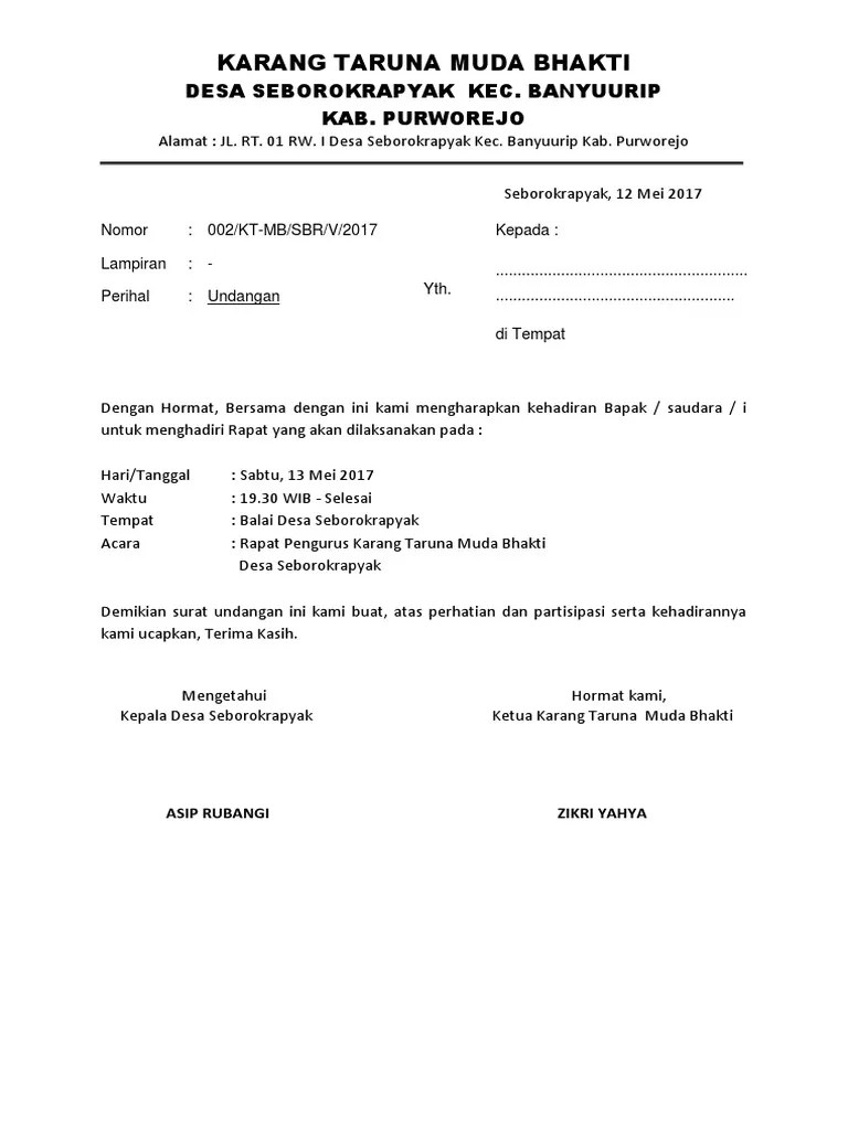 Download contoh pembuatan undangan rapat desa rt dan rw doc download format . Hormat kami, kepala desa seuleumbah. Admin tulis dan bagikan hari ini yaitu contoh surat undangan rapat desa yang mana ini tentu akan sangat berguna sekali terutama. Desa bisa memodifikasi dan improvisasi sesuai keinginan sobat desa dan kepala desa. Untuk mempersiapkan acara perayaan hut ri setiap tahunnya, kepala desa pun bisa terlebih dahulu mengadakan rapat .